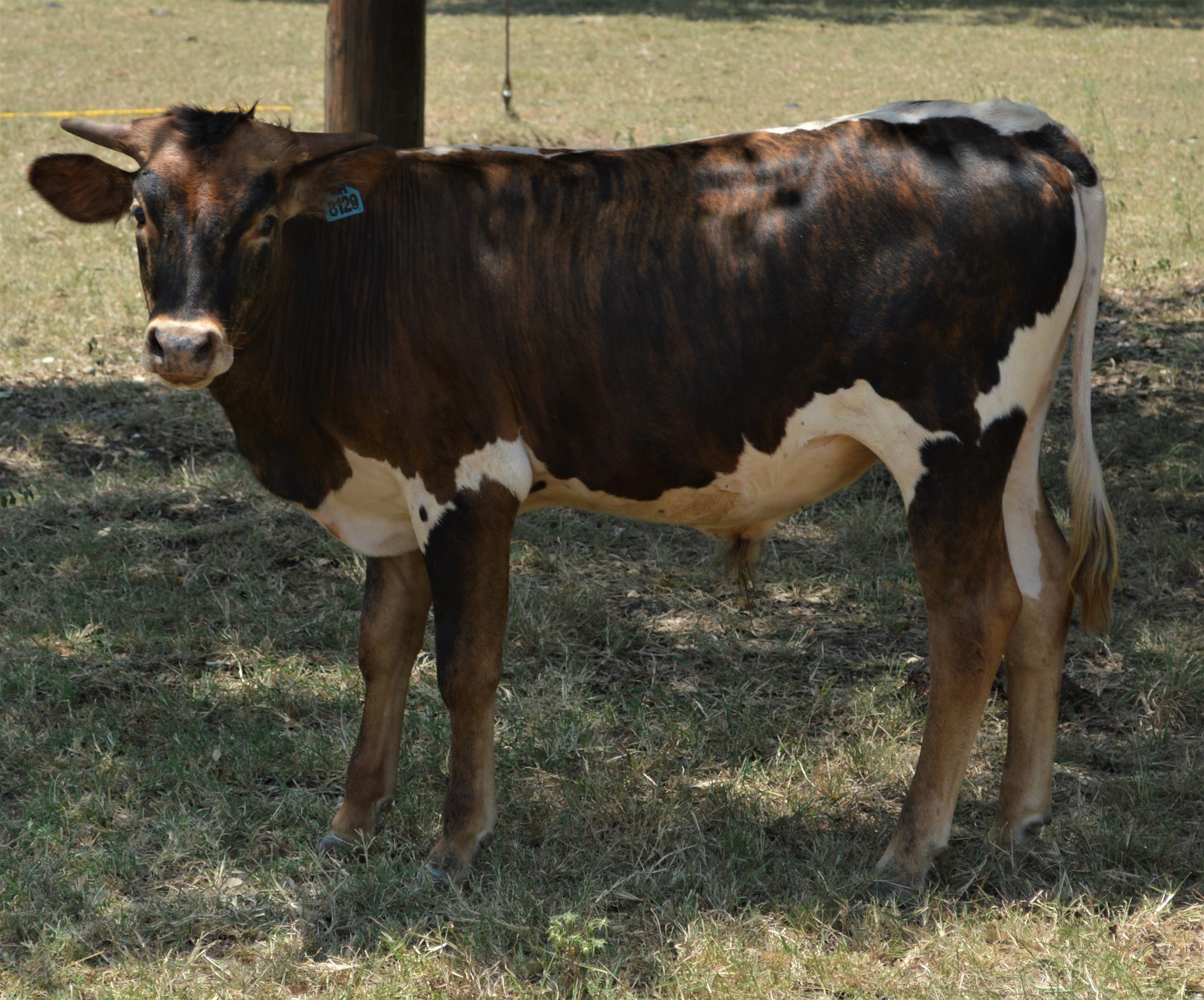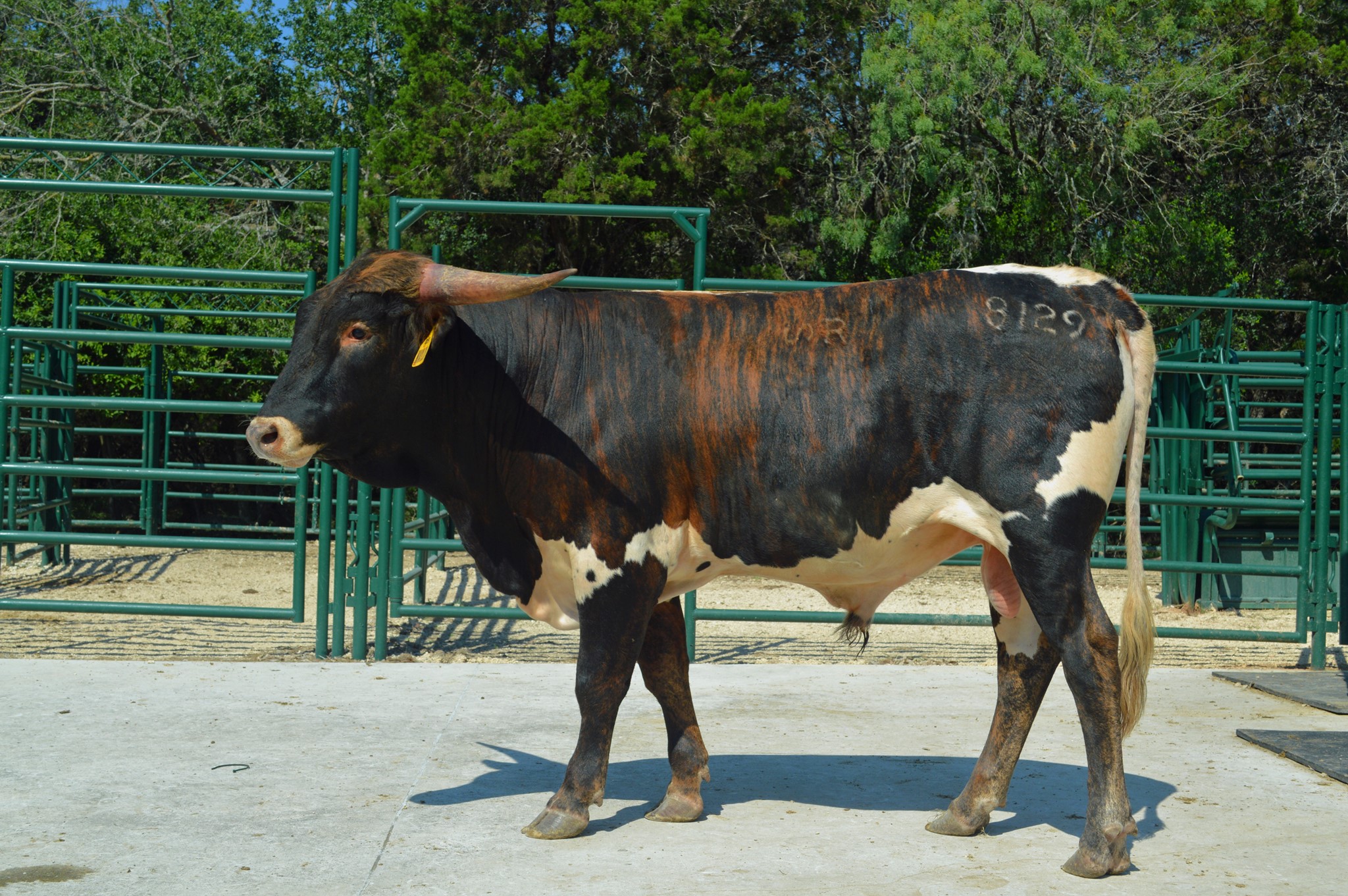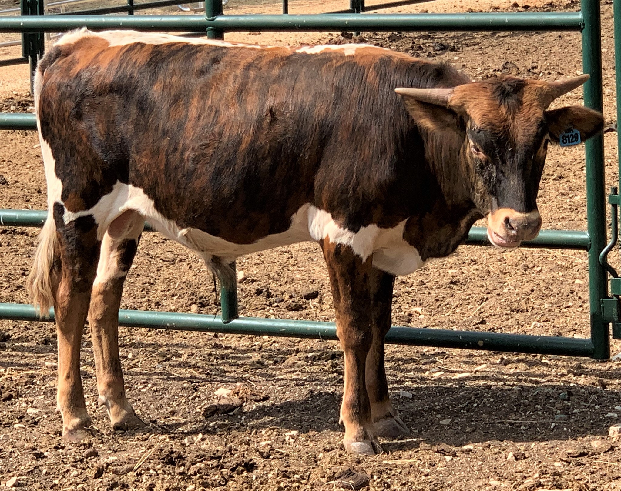 Dark brindle with dark face, white lineback, and white underbelly