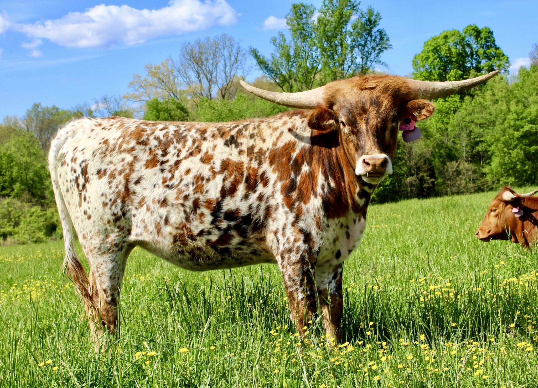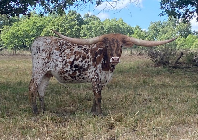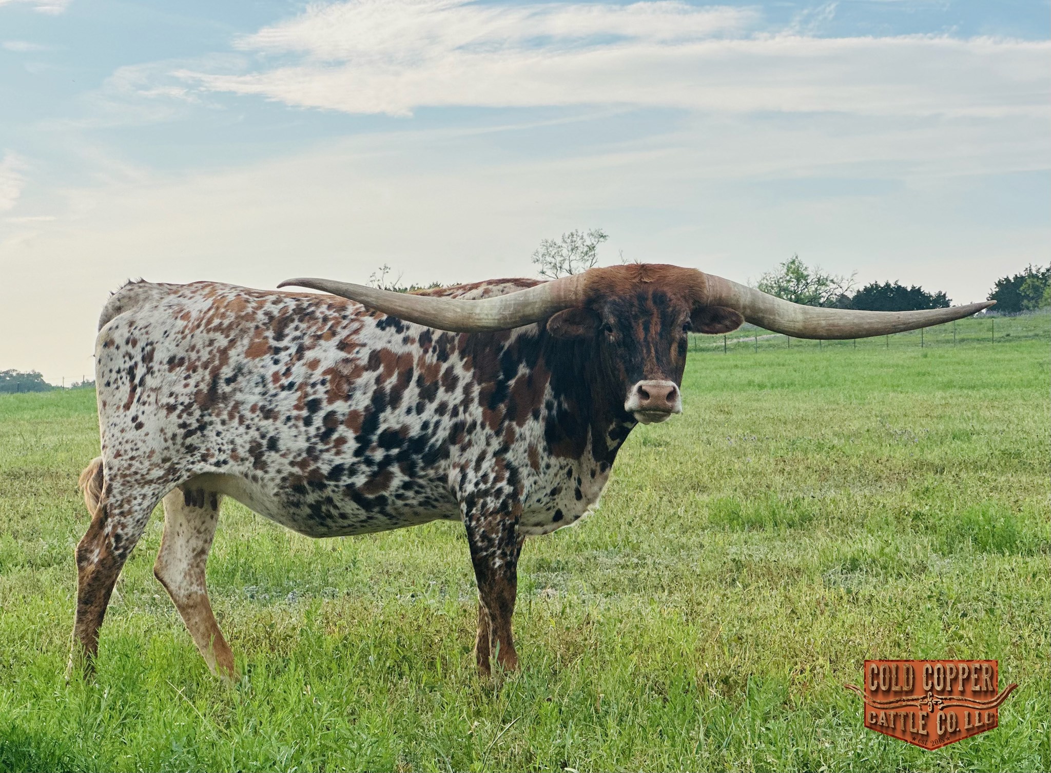 What a beautiful addition to Cold Copper. She is as sweet as she is colorful, and a horn set to die for. She gave us a beautiful heifer by PCC DARK KNIGHT and is currently exposed to POWERWAGON! Check him out