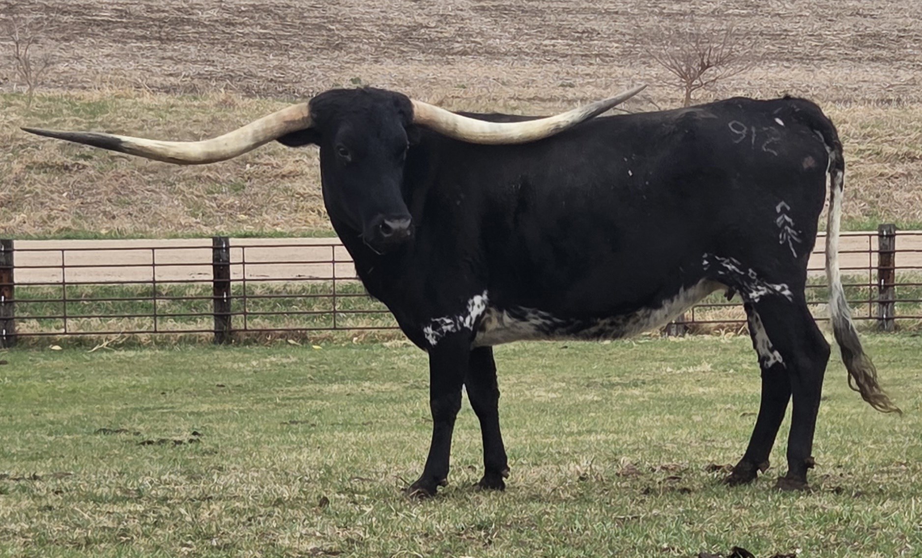 Low, tightly twisting lateral horn in a True Black cow. Very gentle disposition. She consistently produces color and flash! Confirmed bred to Tuff it Out. She crossed 80" as a 5 year old and is over 84" as a fresh 7 year old.