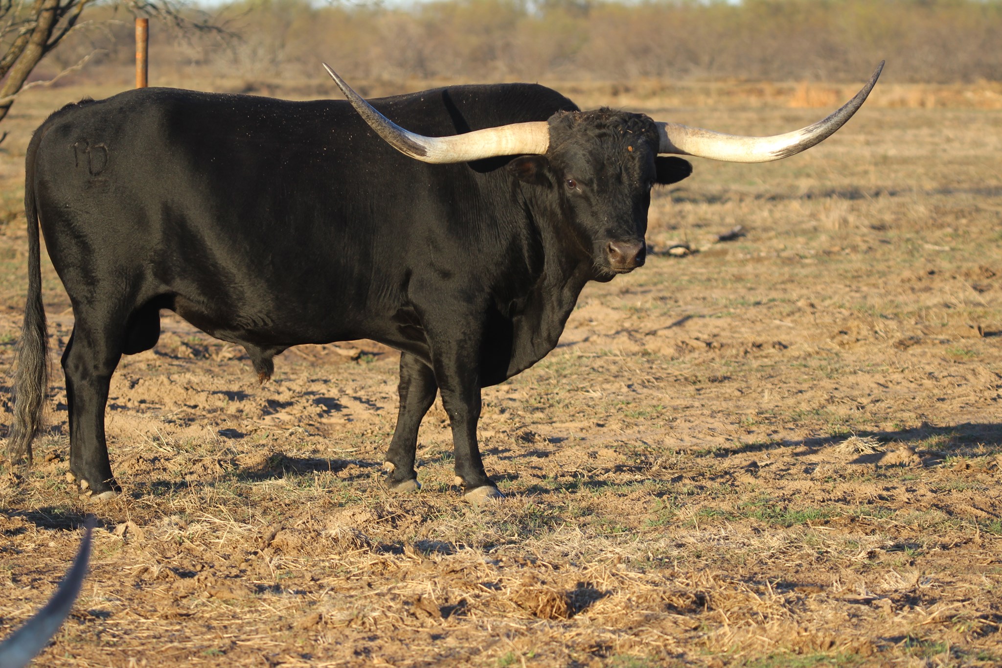 Rare black son of Concealed Weapon and the big bodied, easy fleshing, huge horned B-C Doc’s Sugar Pie. Bill's first offspring to drop at Feral Ranch is a riot of color.
