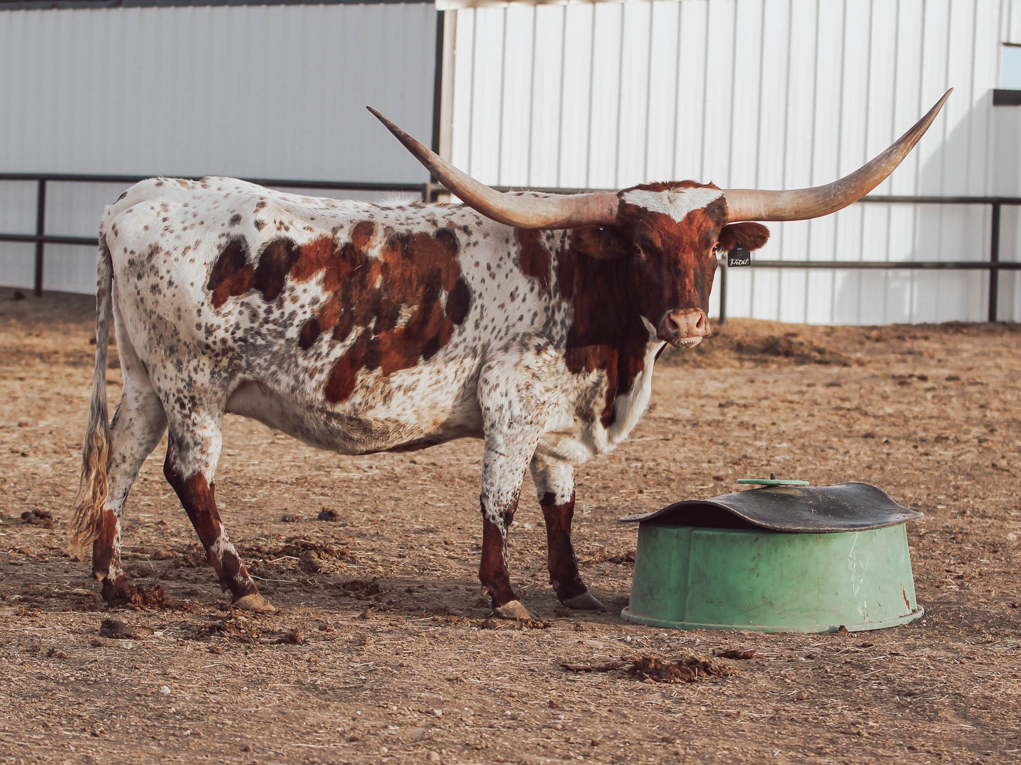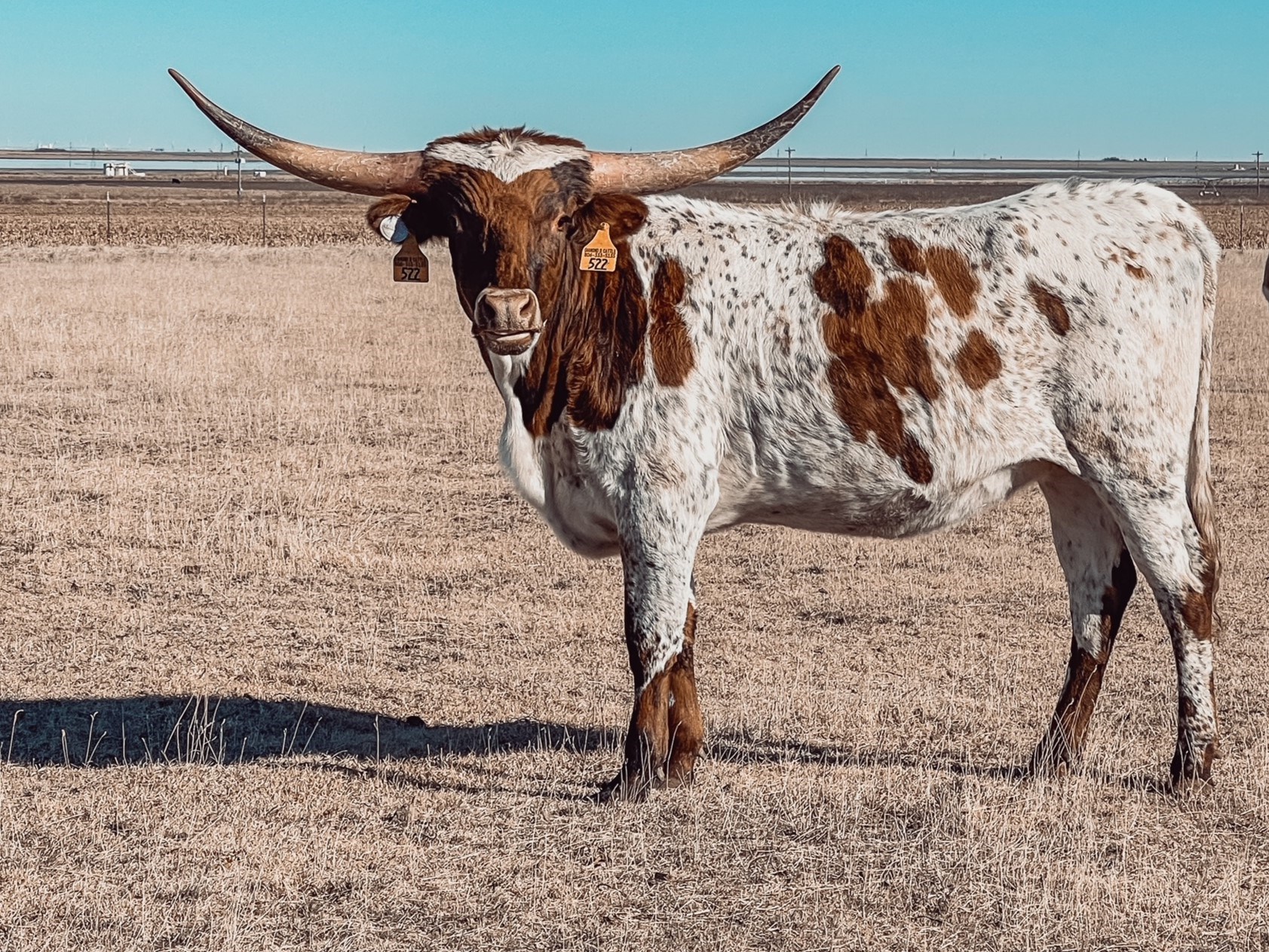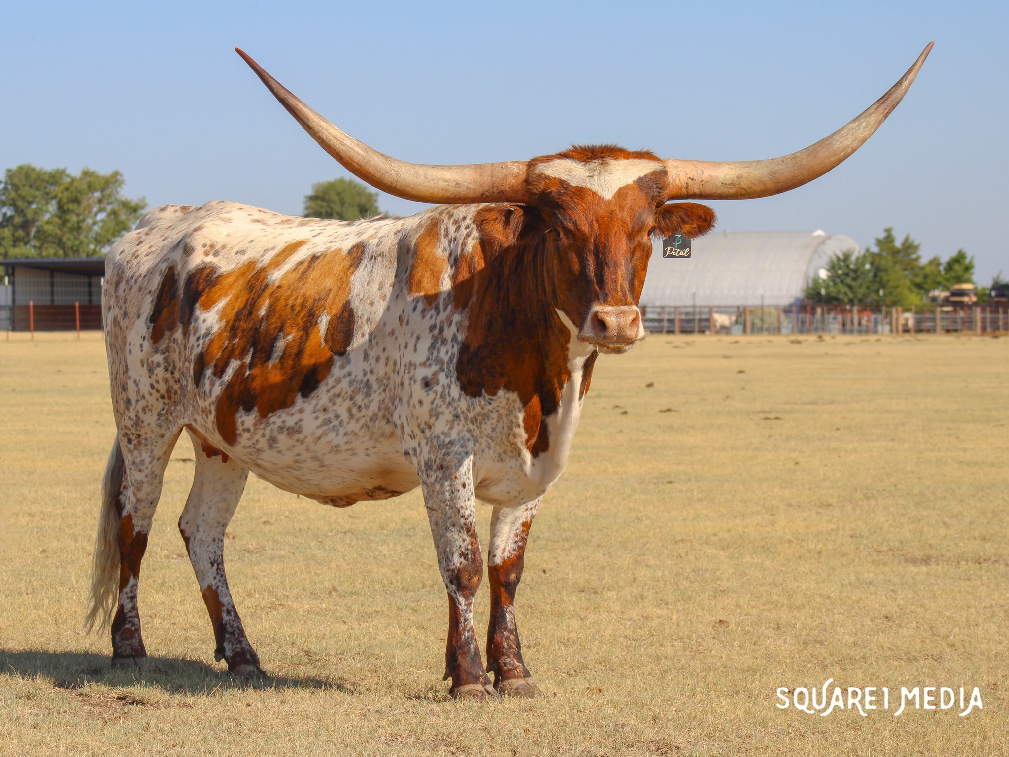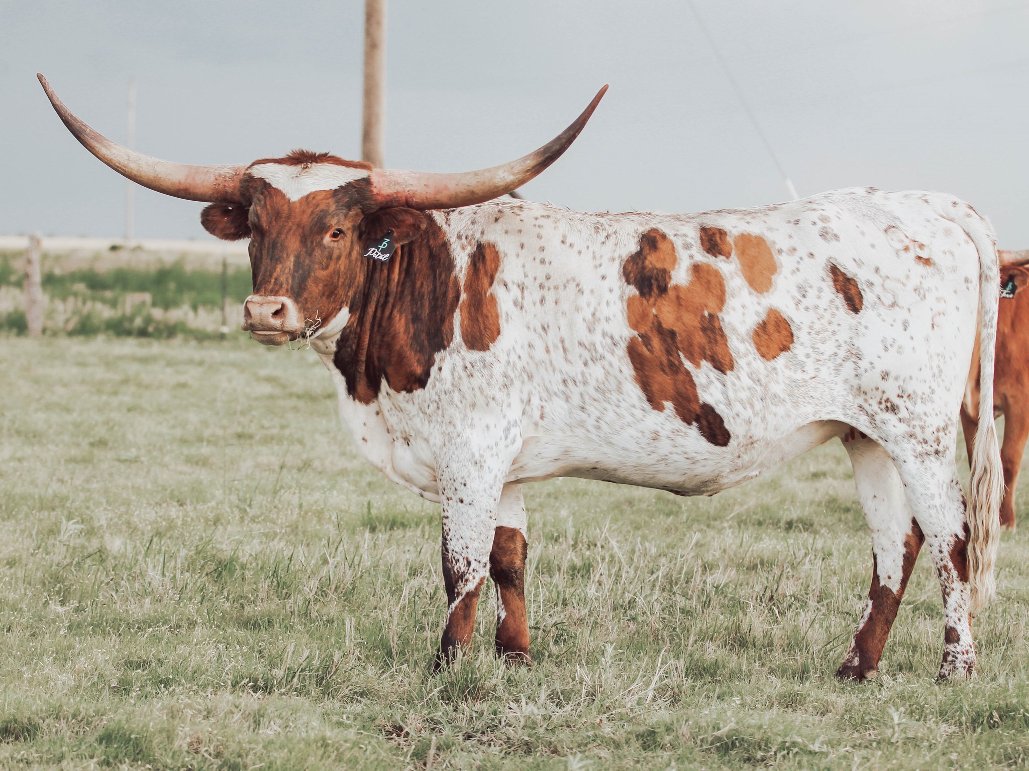 Big, bodied, flashy brindle and white heifer out of Cut'N Dried going back to J.R Laredo and Capone on the bottom side. She's got lots of horn that is beginning to roll out.