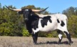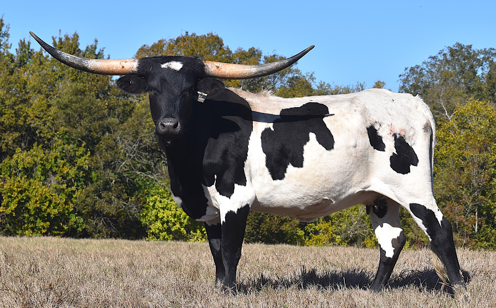 Gorgeous black and white heifer by HL Jango and the twisty horned BL Kahola that is a Cowboy Tuff Chex daughter. Her full sister sold at the 2024 Hudson/Valentine sale for $19,000. We are excited for the future of this beautiful heifer!