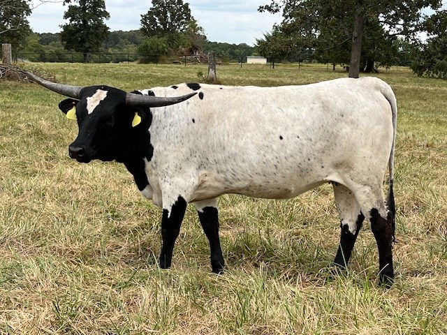 So very proud of this heifer...brood cow prospect deluxe...Super Gentle...Great color and powerful conformation...Body Score of 6 ...not fat...Black Horns are Lateral and growing Great ...Have been averaging around 2 inches per month since a year of age...45" TTT at 17 mos ..Should hit close to the 60 " Mark by age 2..True Black ..color goes back 4 and 5 generations top and bottom... possible homozygous...Neg for Johnes, Brucellosis, and TB.... Not Exposed ...Normal reproductive exam ...RTS score (Bovine Reproductive Score) of 4 ...cycling every 3 weeks...Ready to breed for Fall '26 calf.... See mama's show record...Great Futurity career including the HORN SHOWCASE SUPERIOR AWARD......96" Twisty Horn Measurement...Proud of this family ..Lot 46 Horn Showcase Sale