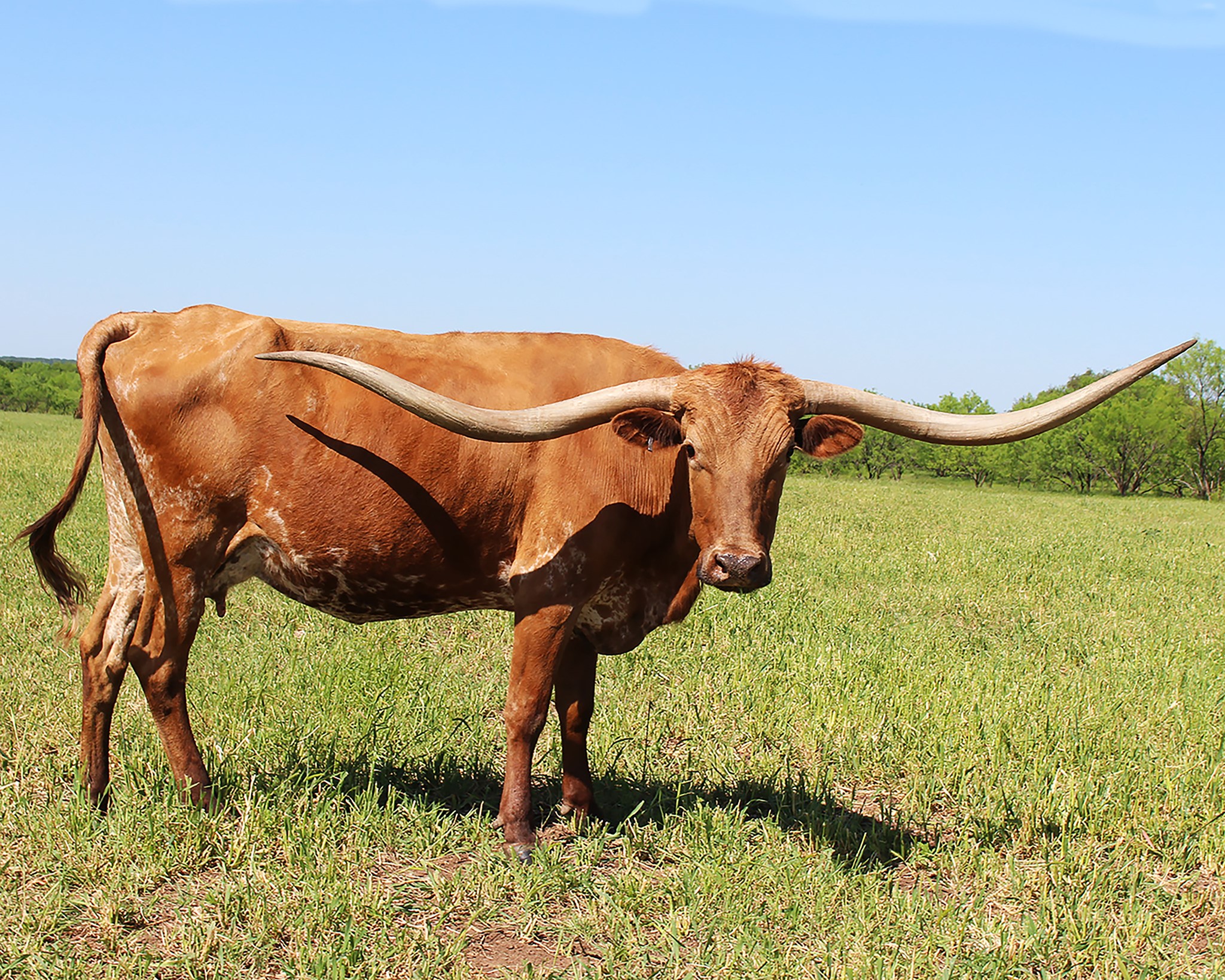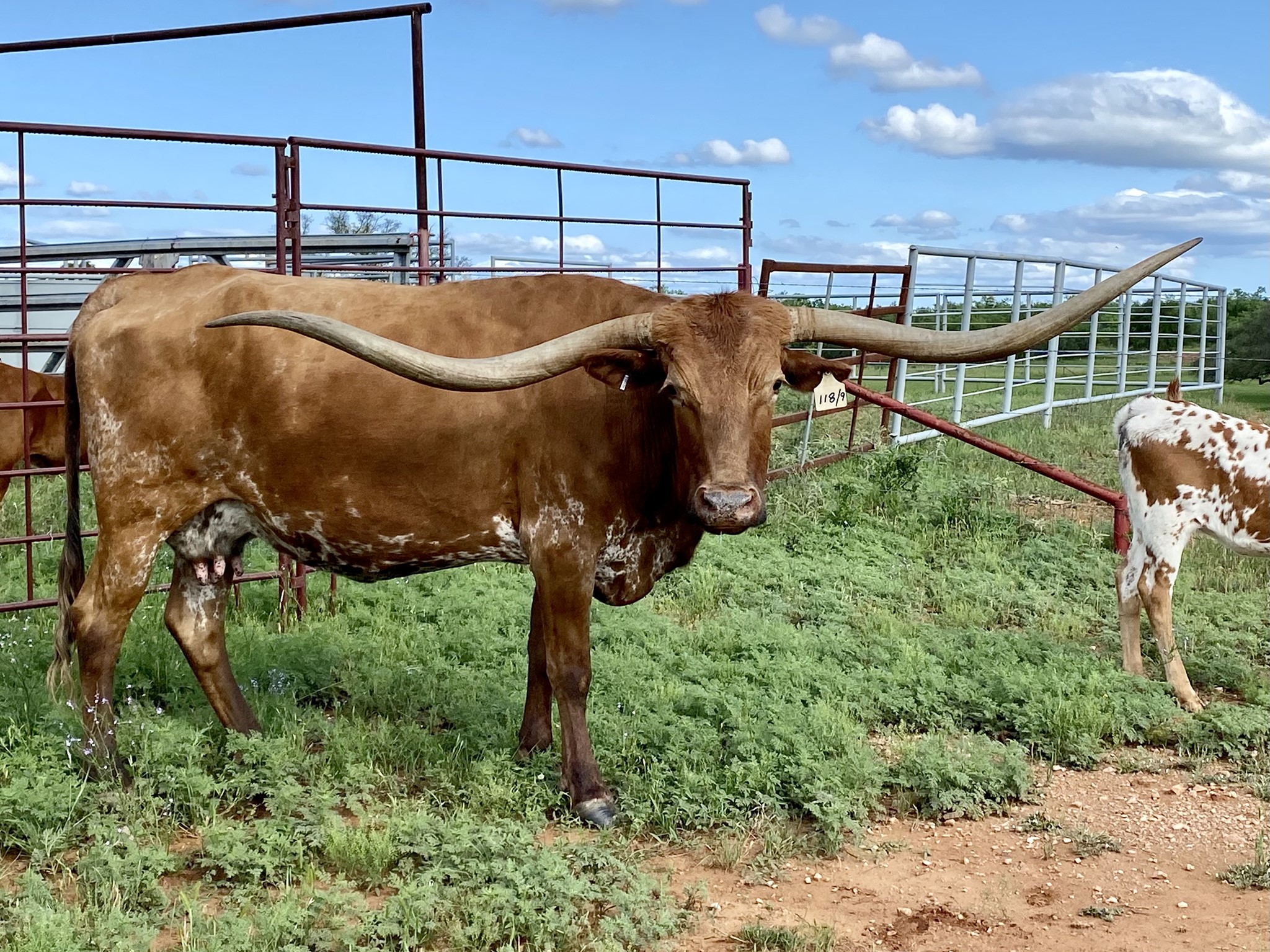 Elegant flat twisty horn cow over 94” TTT. Typical of all SDR Rio Bravo daughters, she is an outstanding milker and a great mother. We are breeding Belle to our special Danica bull CENTURY and hoping the strong lateral hornset in both families continues.