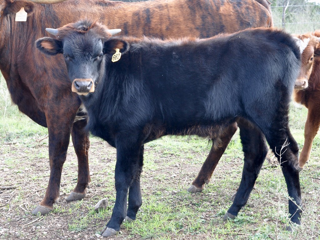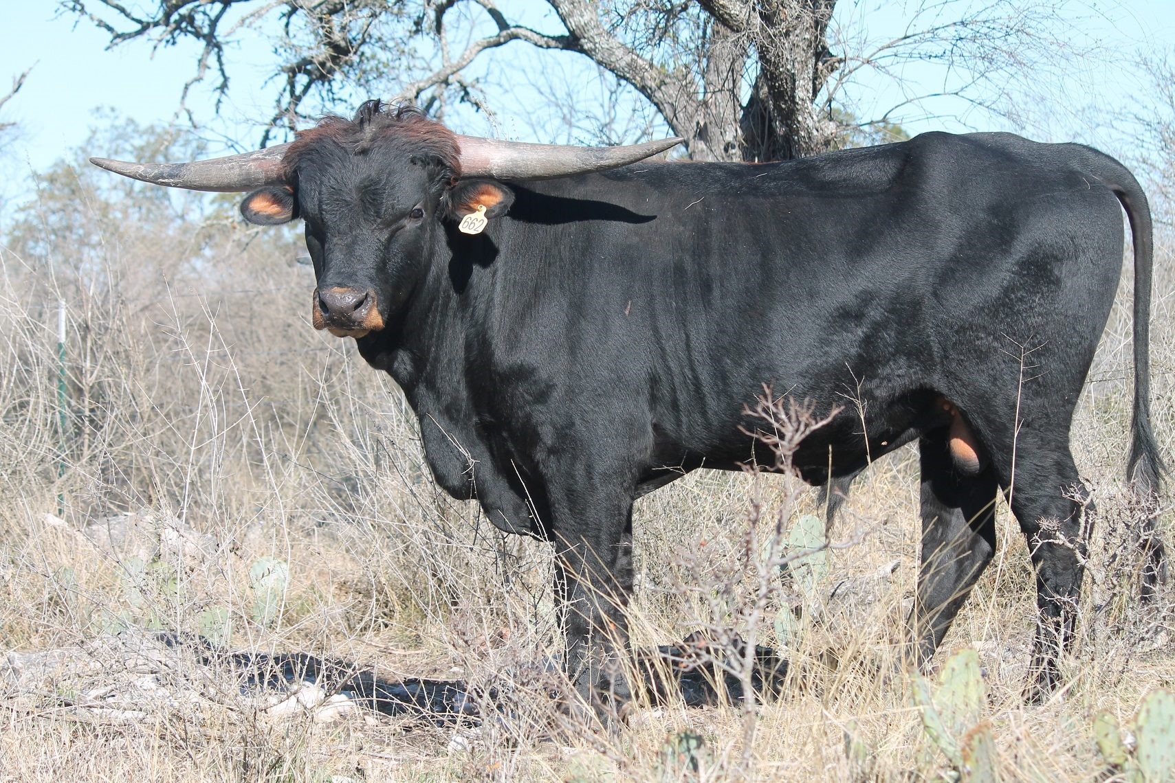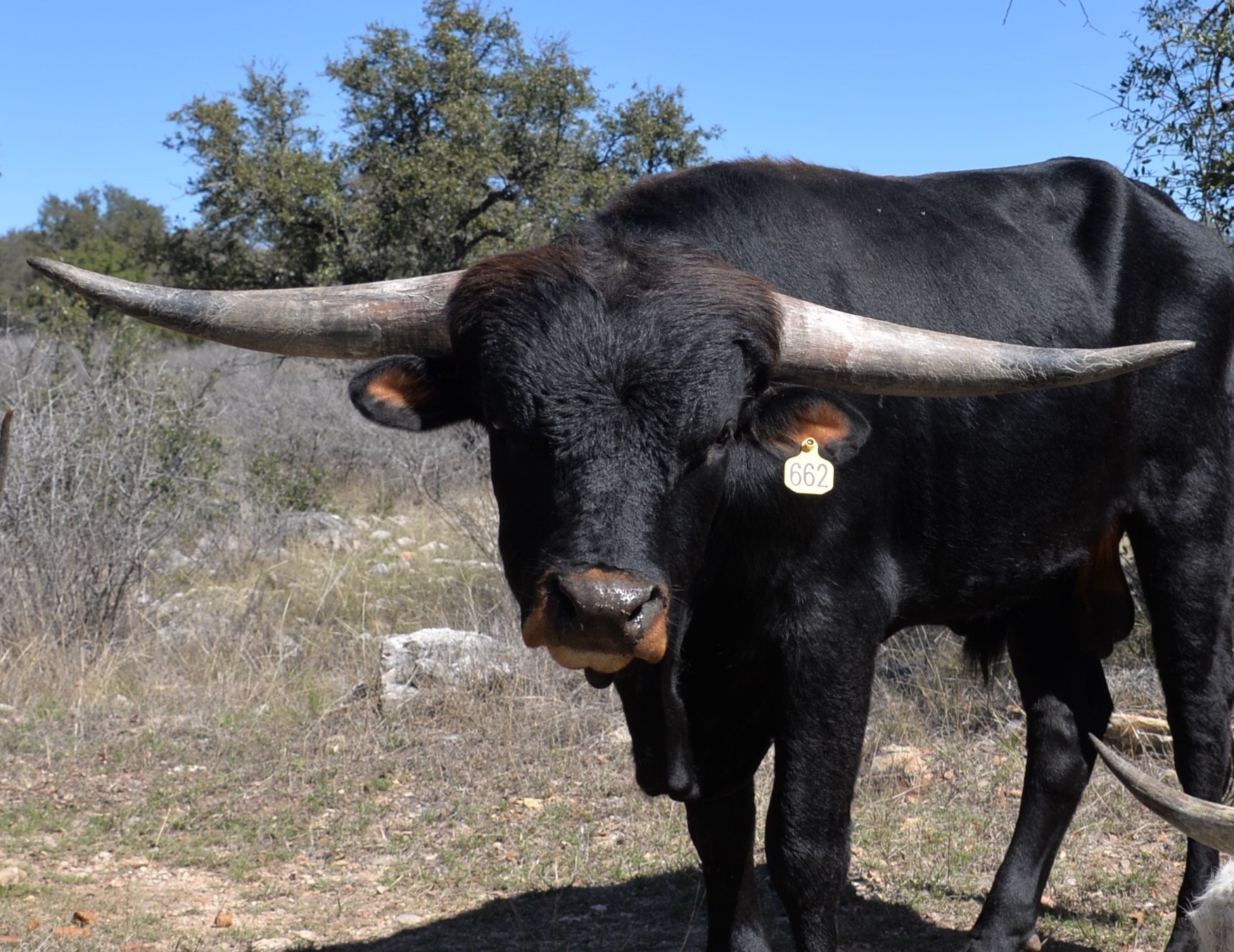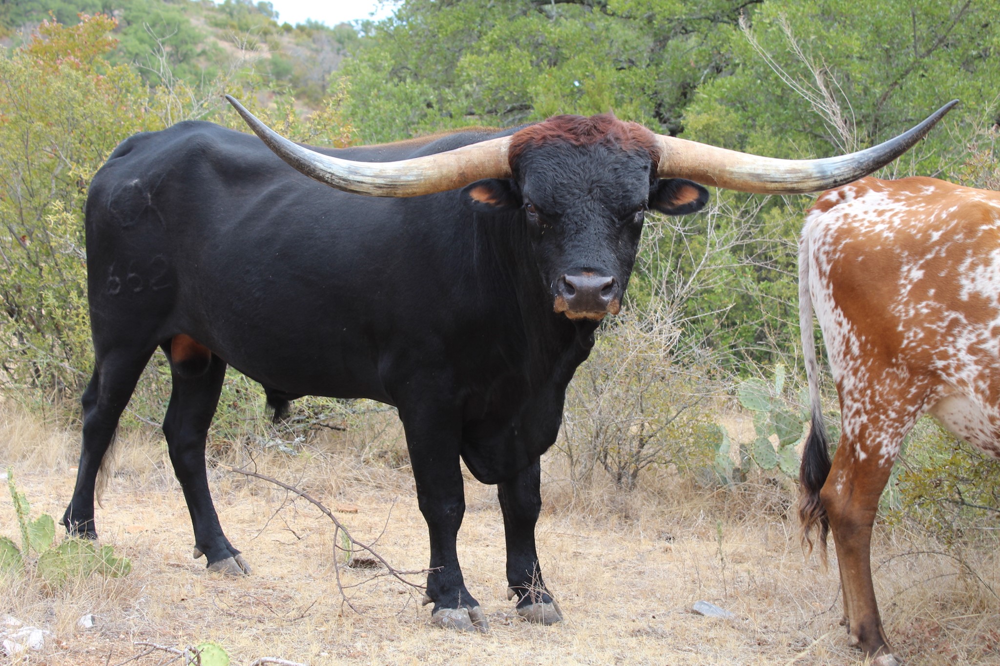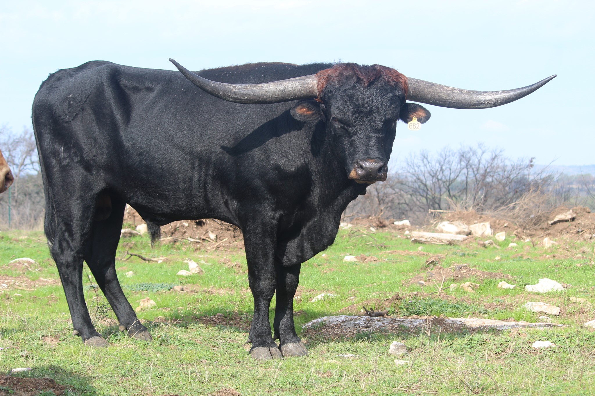 This handsome, thick bodied bull has lots of promise - he is tall, dark, strong, and has an excellent pedigree. We're hoping Tomboy turns out as well as his full brother KDK Valiant! We haven't seen many parker brown Longhorn bulls and think Tomboy will bring some striking colored offspring to our herd. He has twist genetics in both top and bottom of his pedigree, which we hope he adds to his offspring.