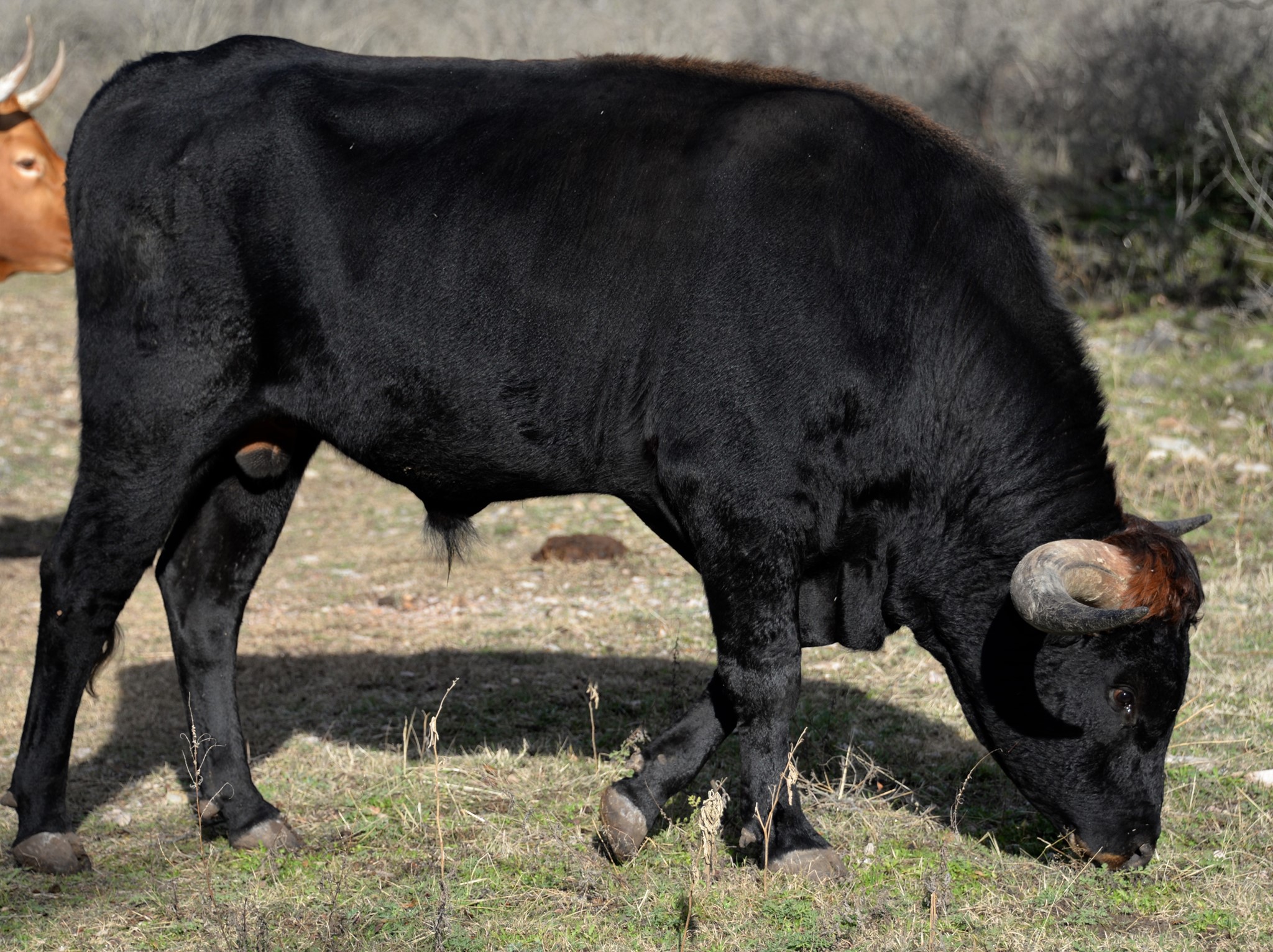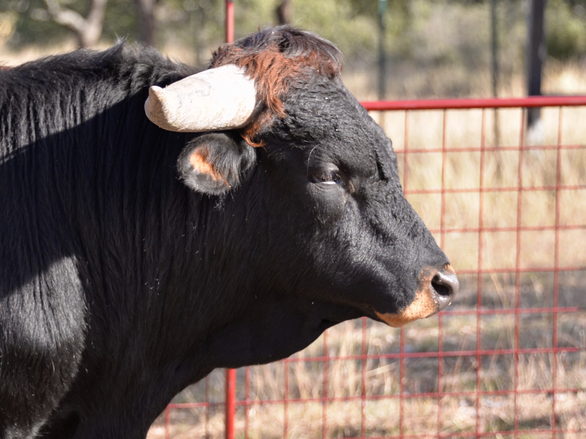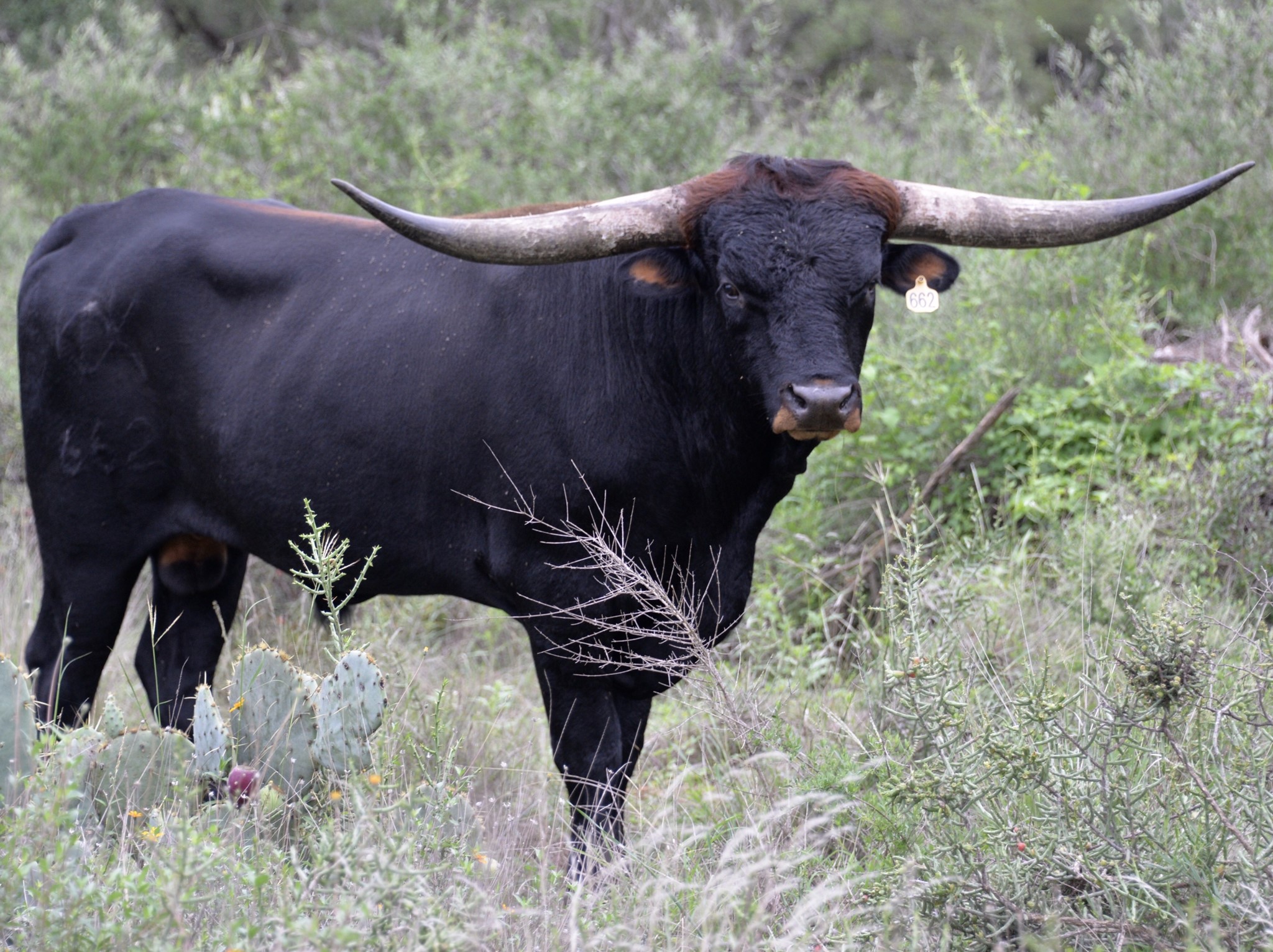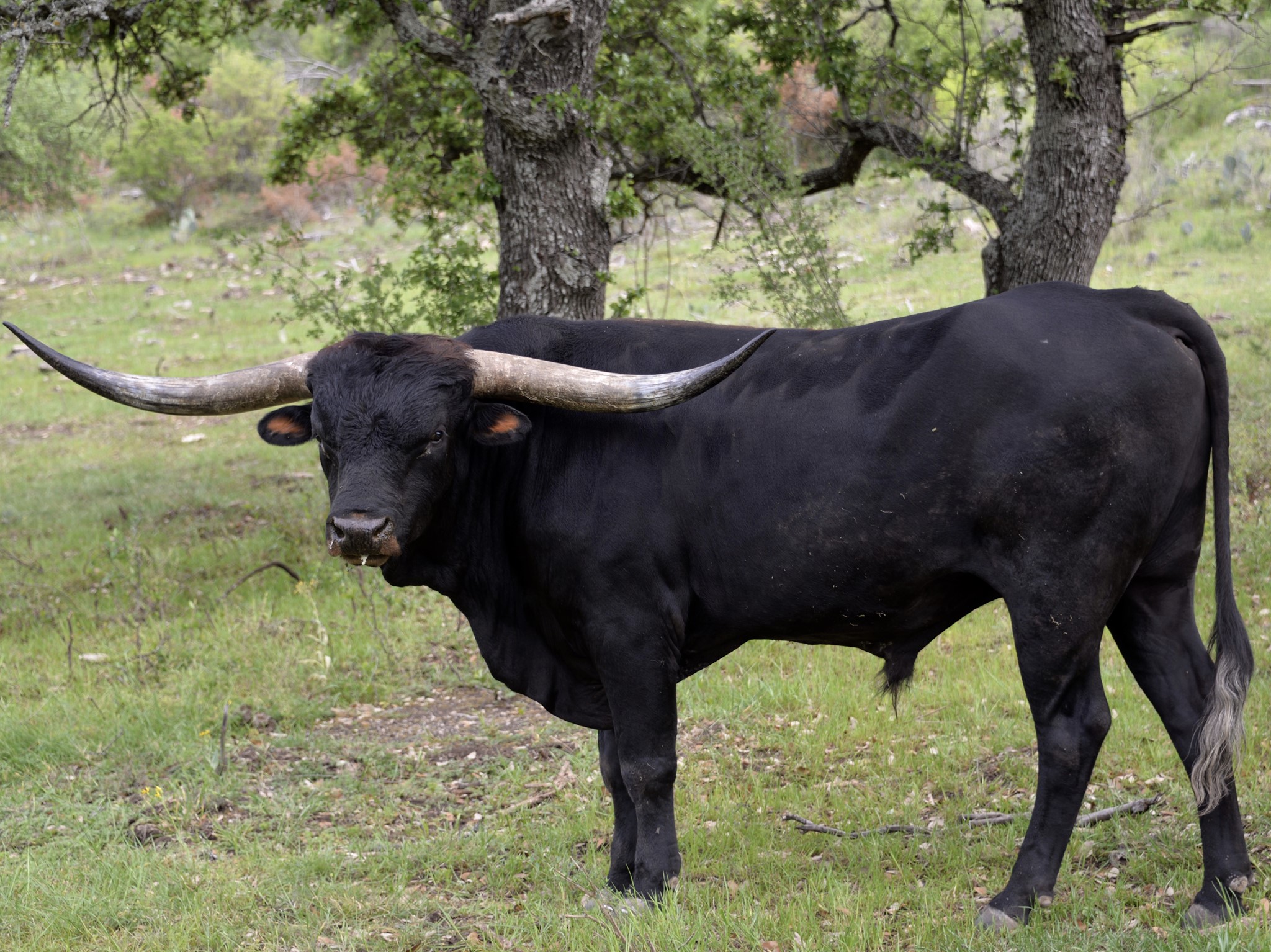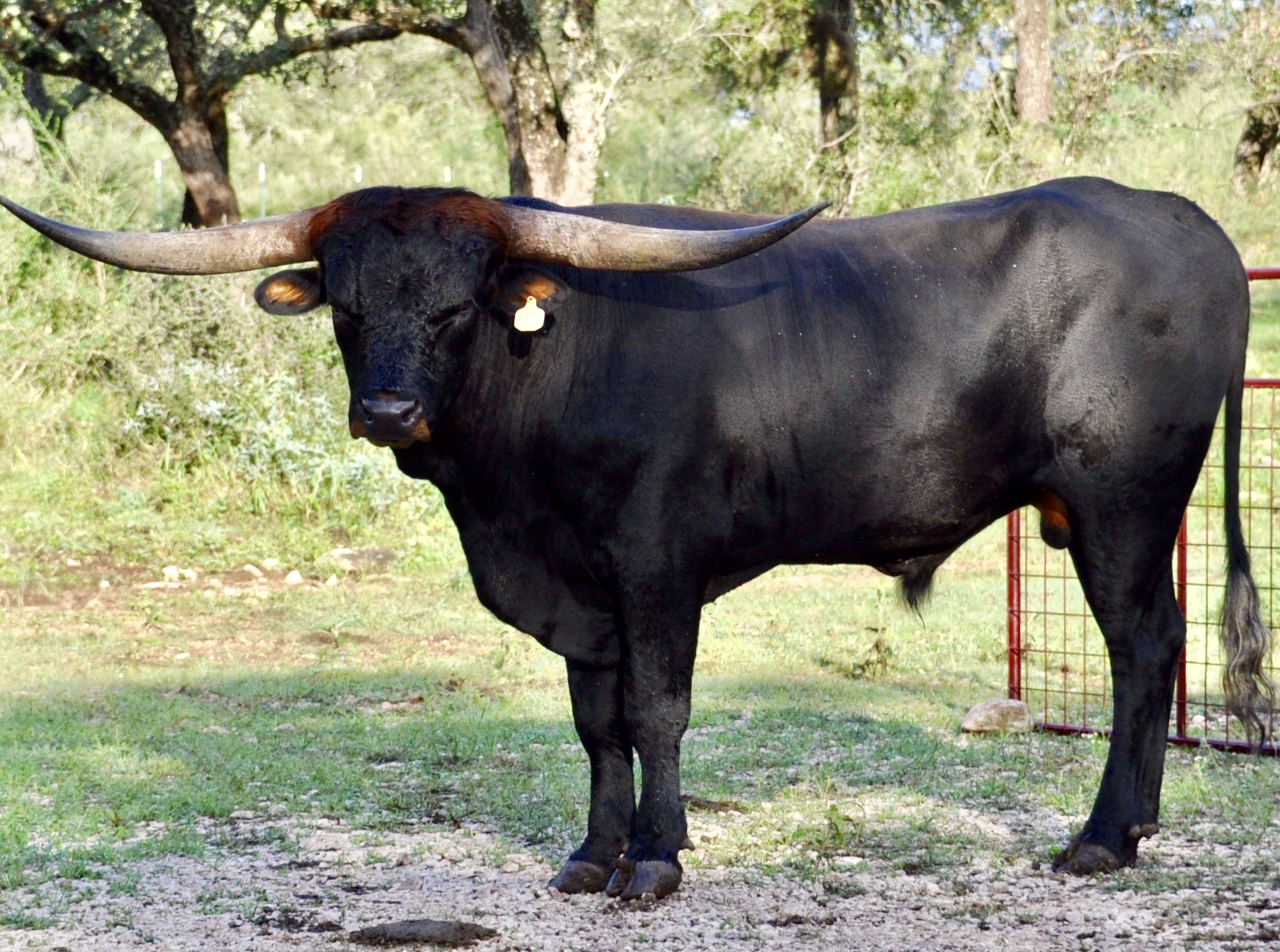 This handsome, thick bodied bull has lots of promise - he is tall, dark, strong, and has an excellent pedigree. We're hoping Tomboy turns out as well as his full brother KDK Valiant! We haven't seen many parker brown Longhorn bulls and think Tomboy will bring some striking colored offspring to our herd. He has twist genetics in both top and bottom of his pedigree, which we hope he adds to his offspring.