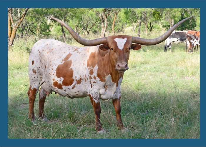 A pretty young cow out of two longhorn legends. Maternal half sister to herd sires Tempter, Over Kill, and Tuff Stuff, and Dickinson's great producing Dragon Pearl cow.
