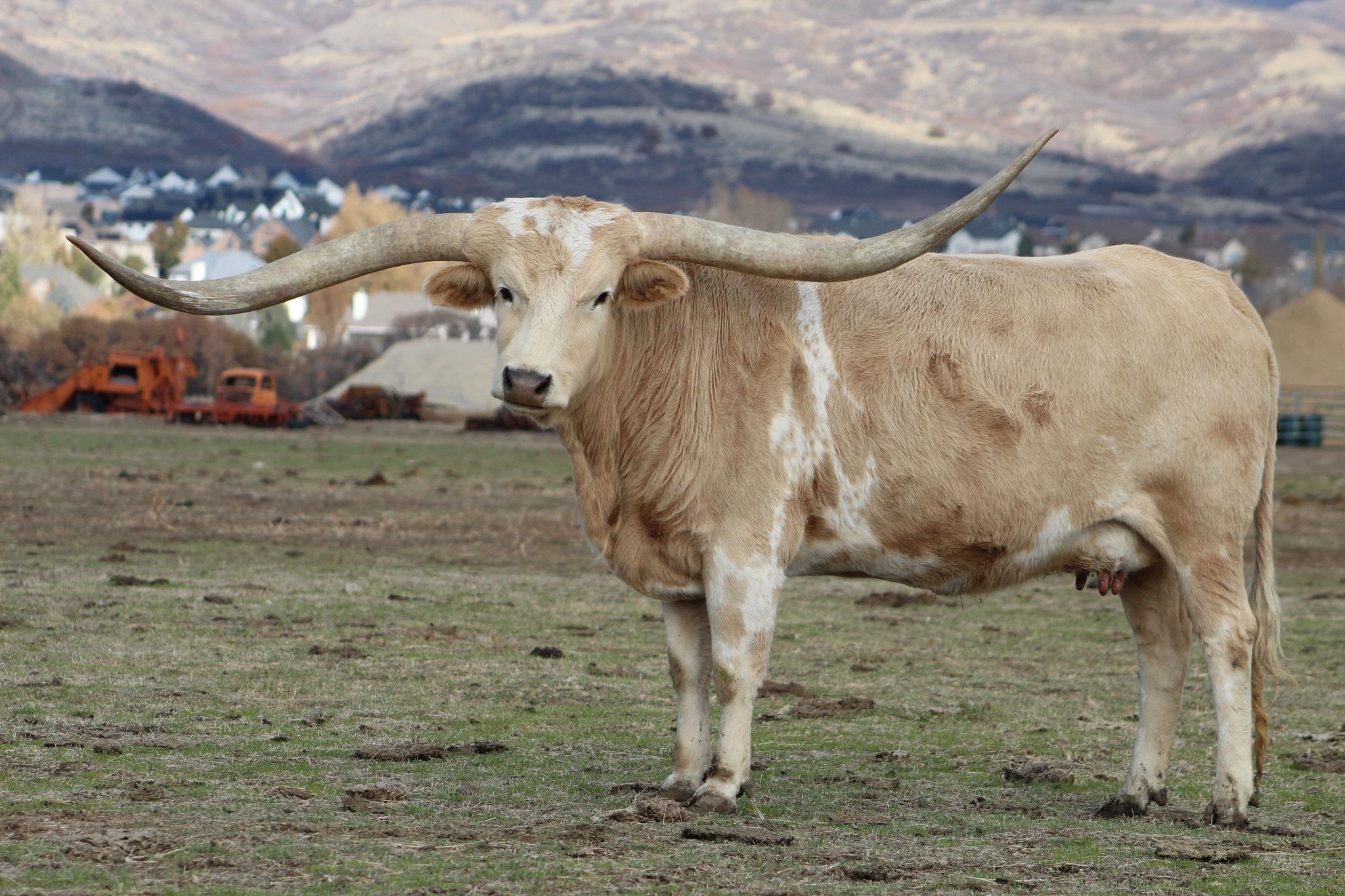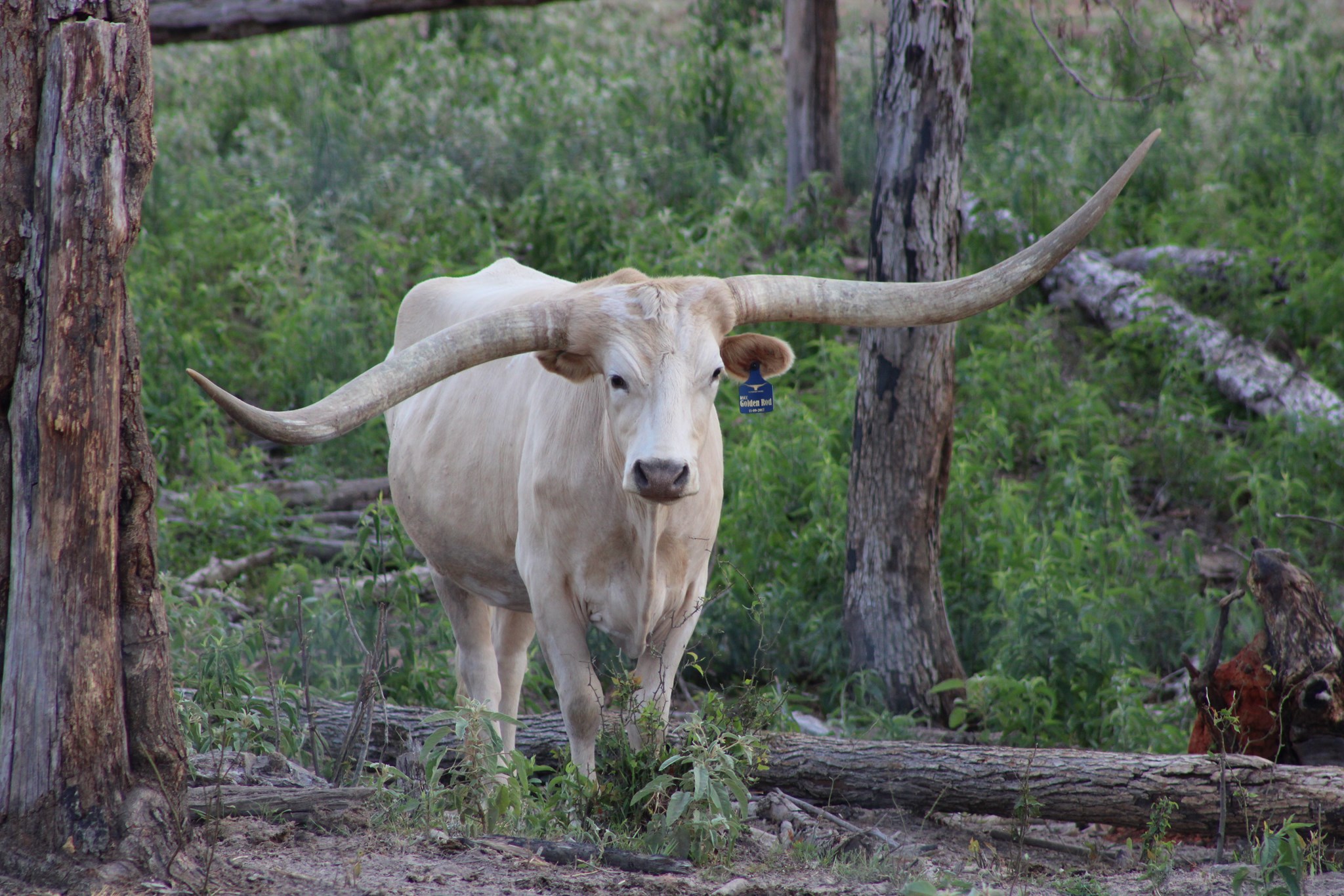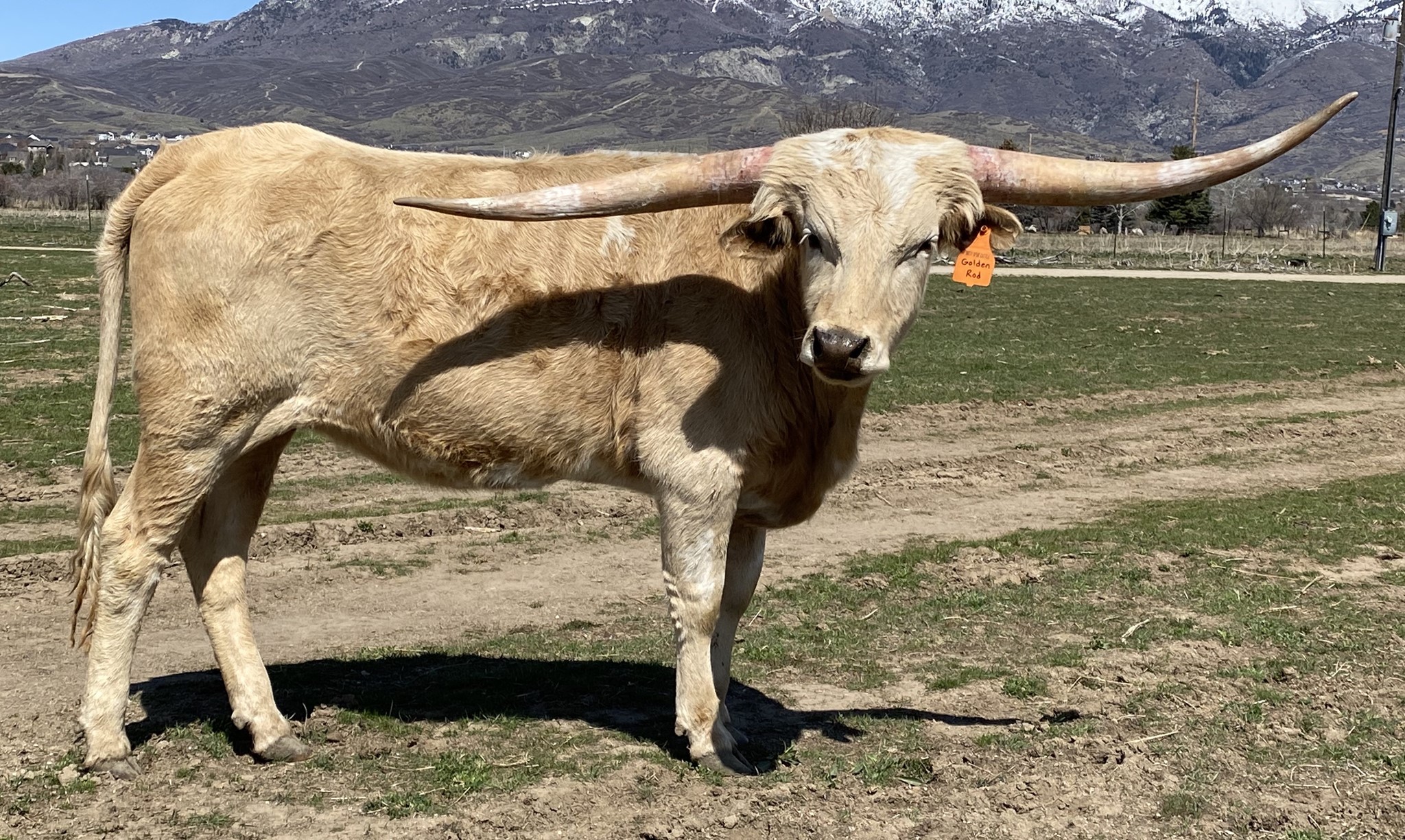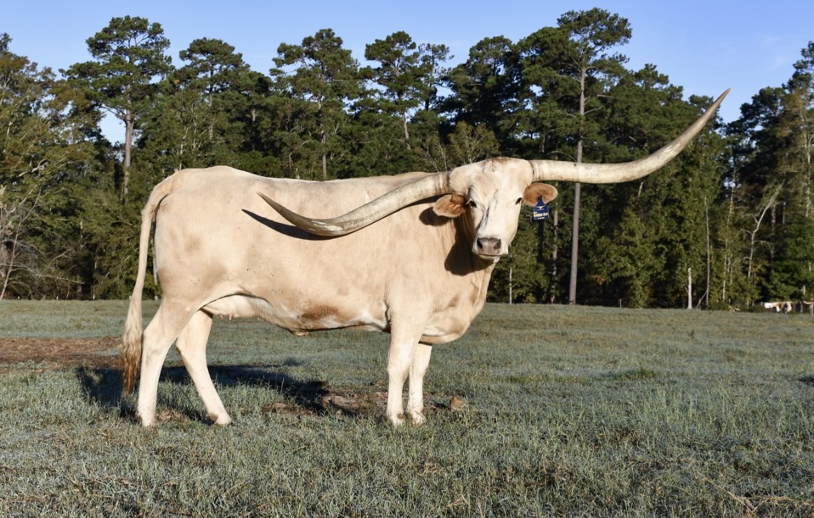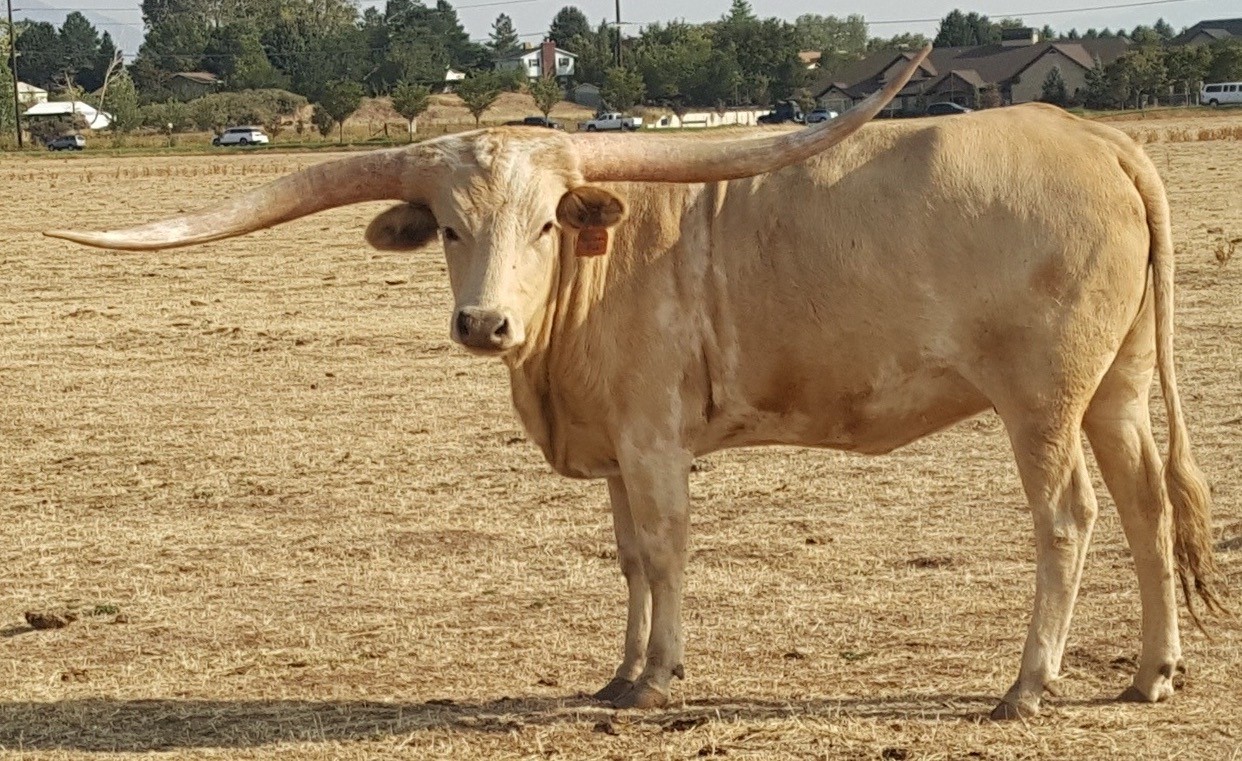 DSCC Golden Rod is the longest horned Gold Mine daughter in the breed. This cream colored beauty has 14 animals over 80 inches tip to tip, including 3 over 90 inch cows (BL Rio Catchit, Shadow Jubilee & Jester). Study her pedigree and you'll find it's pretty amazing! She won her tip-to tip class in 2020 at the Horn Showcase with a measurement of 78" at 33 months. She took 2nd in tip-to-tip at 86.75" in 2021. Cowboy Flair for a