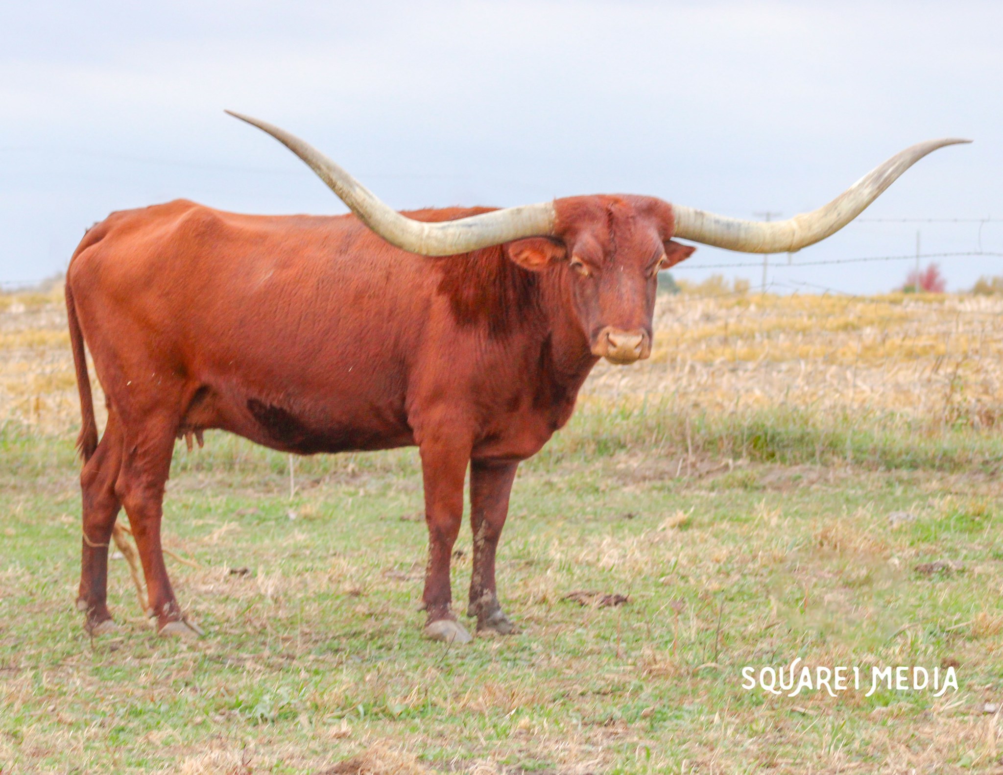 Beautiful feminine traditional longhorn cow boasting tons of horn an twist out of the famous Rio Bravo Chex bull. She has a beautiful horn set that is 85" TTT. Bravo has a beautiful heifer calf at side by Cowboy Cassanova's Pride